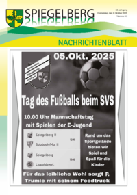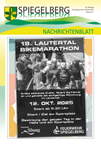 58. Jahrgang Donnerstag, den 2. Oktober 2025 Nummer 40 NACHRICHTENBLATT 2 Nummer 40 2. Oktober 2025 DIE GEMEINDEVERWALTUNG INFORMIERT AUSSTELLUNGEN IN SPIEGELBERG Straßensperrung Sperrung…