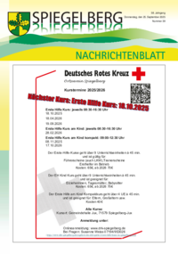 58. Jahrgang Donnerstag, den 25. September 2025 Nummer 39 NACHRICHTENBLATT Ortsverein Spiegelberg Kurstermine 2025/2026 Erste Hilfe Kurs: jeweils 08:30-16:30 Uhr 18.10.2025…