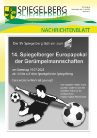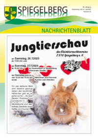 58. Jahrgang Donnerstag, den 24. Juli 2025 Nummer 30 NACHRICHTENBLATT am Samstag, ab 17.00 Uhr und 26.7.2025 am Sonntag, ab 10.00 Uhr 27.7.2025 des Kleintierzuchtvereins Z 310 Spiegelberg e. V.…