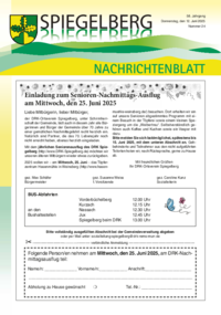 58. Jahrgang Mittwoch, den 28. Mai 2025 Nummer 22 NACHRICHTENBLATT I m Namen der Gemeinde Spiegelberg danke ich den Schülerinnen und Schülern der Verlässlichen Grundschule Spiegelberg ganz…